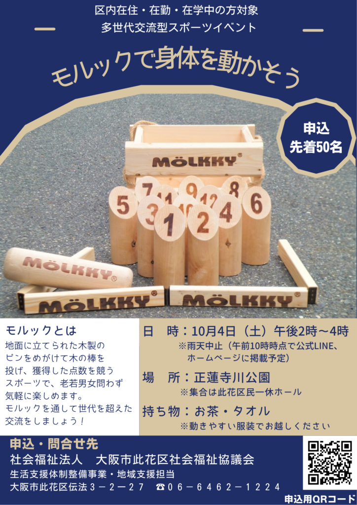 2025.08.18 イベント お知らせ 生活支援 多世代交流型スポーツイベント『モルックで身体を動かそう』開催のご案内 今年度もモルックのイベントを開催することになりました。 モルックは性別、年齢関係なくみんなで楽しむことができるスポーツです。 ぜひお申込みのうえご参加ください。 イベントの詳細については下記をご覧ください。