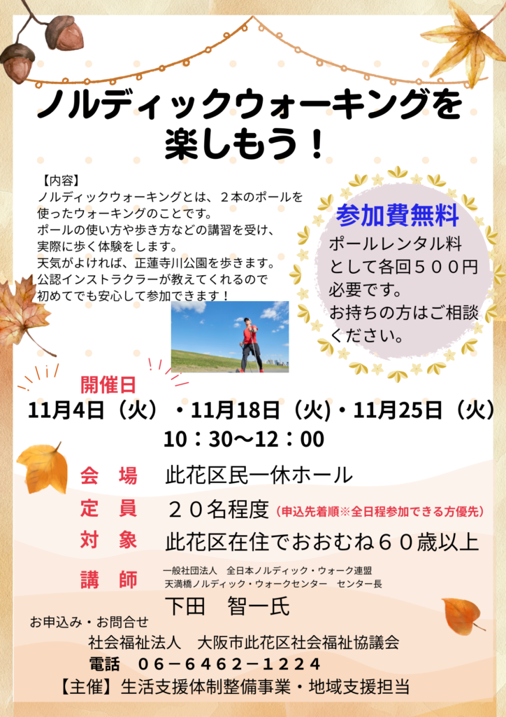 2025.10.22 イベント 生活支援 講座・講演会 ノルディックウォーキングを楽しもう!開催のご案内 ノルディックポールを使った歩き方の講習を受け、ノルディックウォーキングを体験するイベントです。天候が良ければ正蓮寺川公園でのウォーキングを予定しています。 詳細は下記チラシをご覧ください。